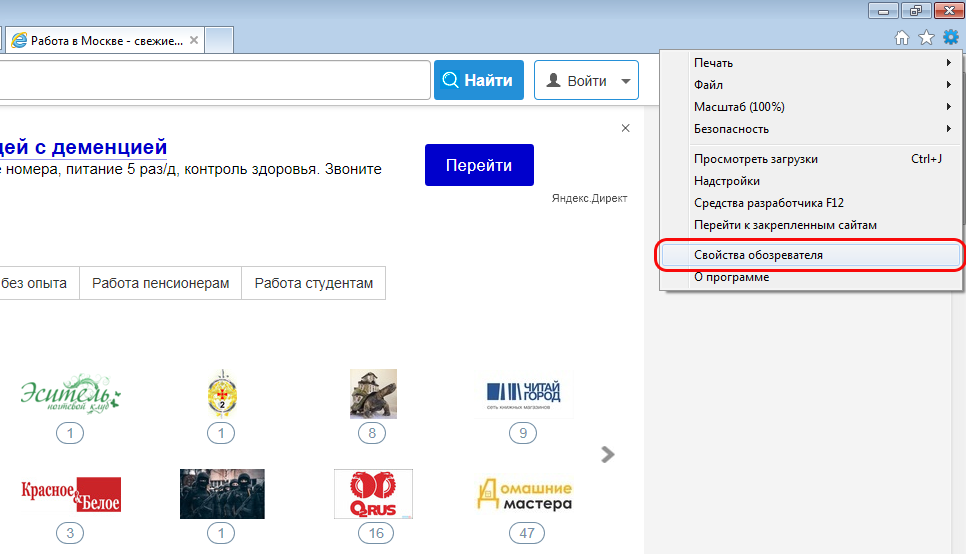 2. Выберите "Свойства обозревателя";