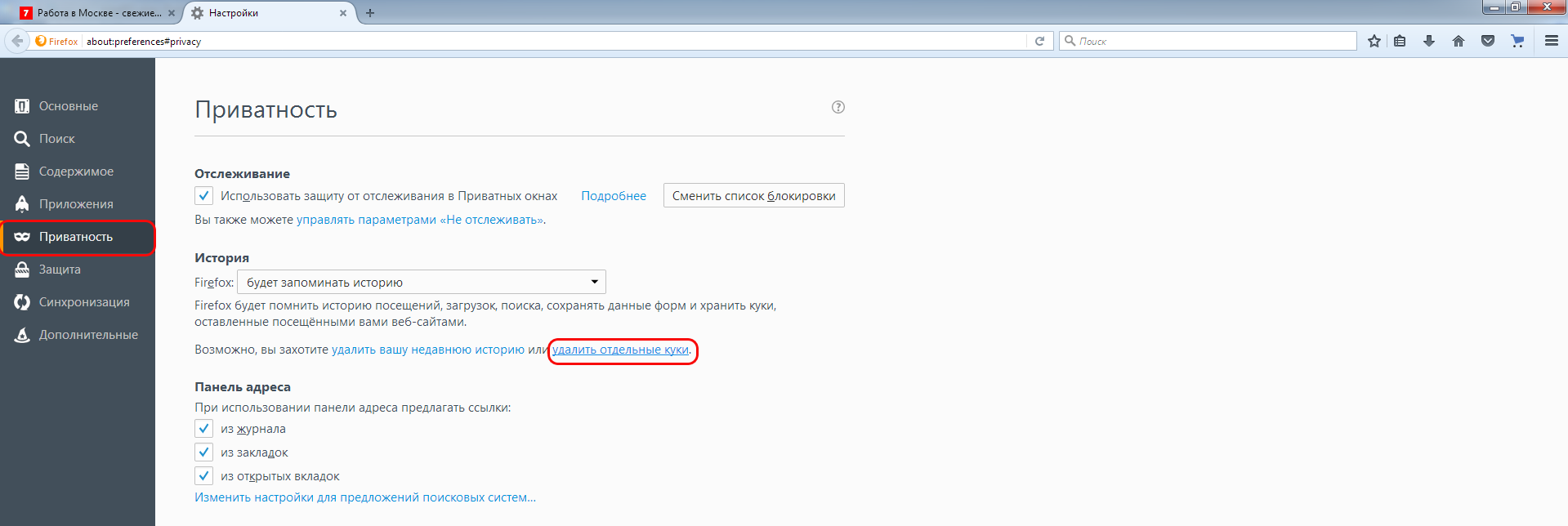 2. Слева выберите вкладку "Приватность и защита";