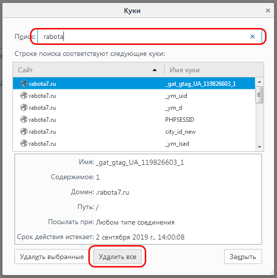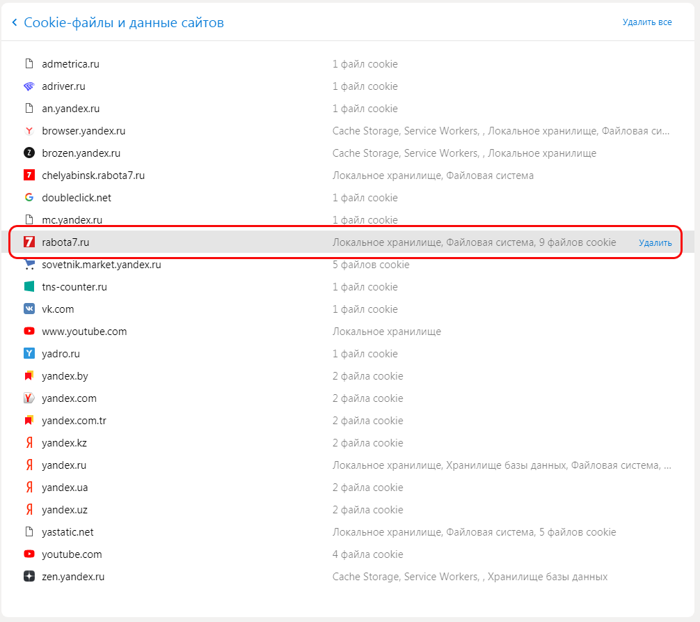 6. В появившемся в пункте "Все файлы cookie и данные сайта" в окне в поисковой строке укажите ключевые слова Rabota7;