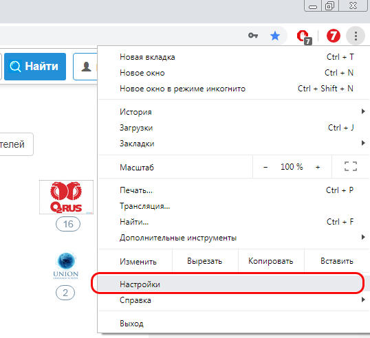 2. Выберите пункт "Настройки";